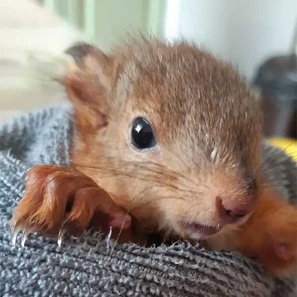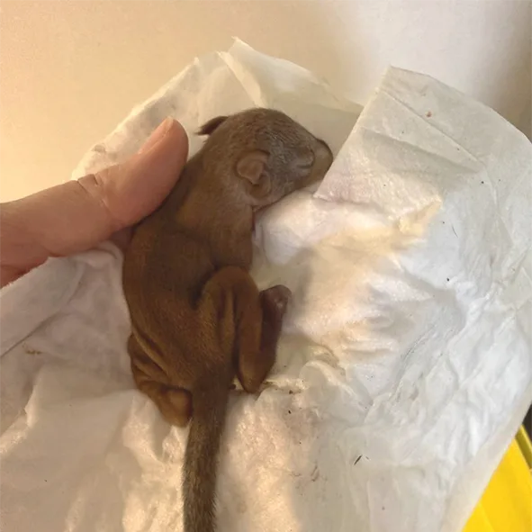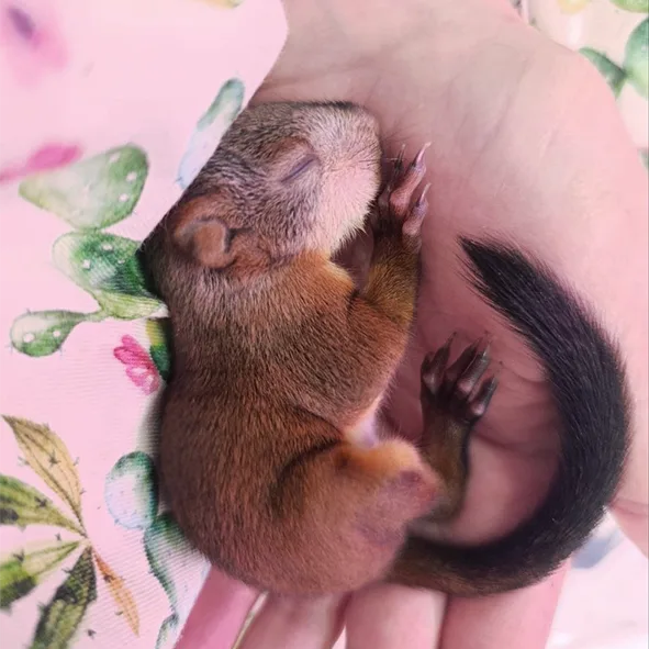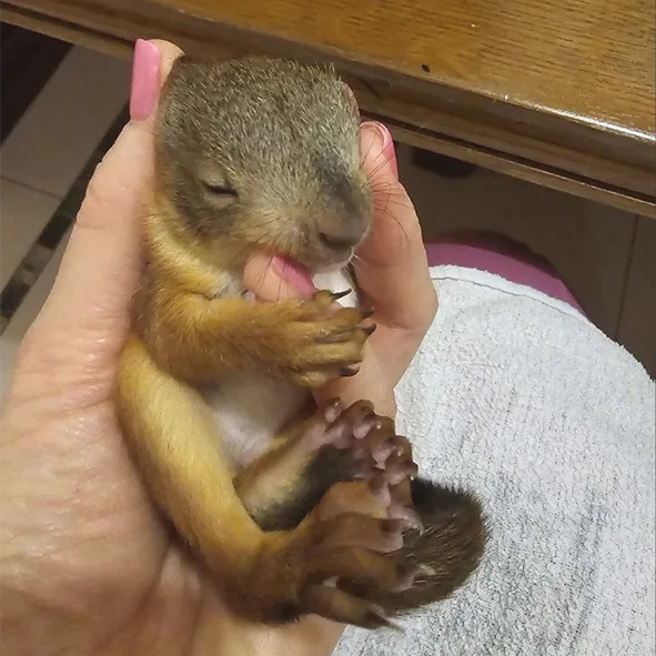 Выпал из гнезда, белка-мать погибла. На выкорме у нашего волонтера