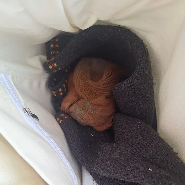 Белка выронила бельчонка. Не забрала. Отправлен на выкорм к волонтеру